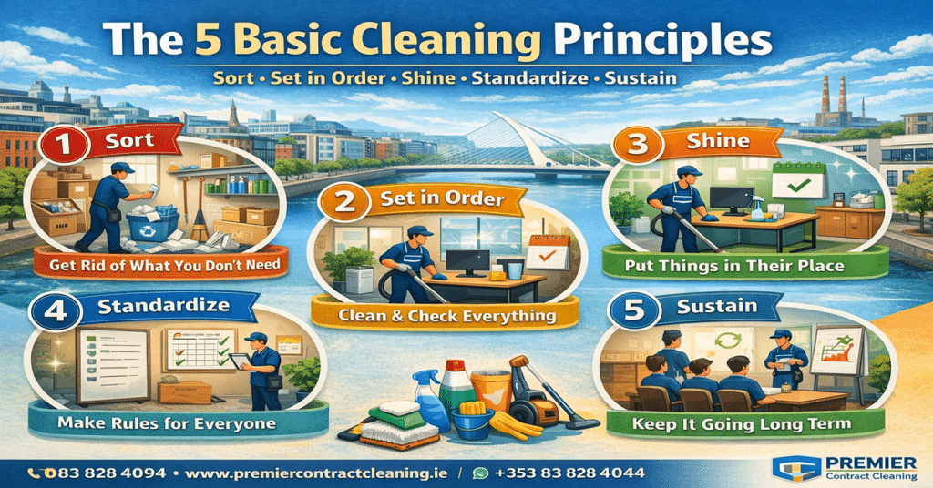 In Dublin offices these principles start with sort to clear old papers then set in order desks for quick find shine wipes to fight germs standardize checklists for teams and sustain with checks. Wet weather means extra shine but they keep spaces productive.